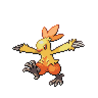 Torchic is a small, chick Pokémon with stubby, downy, yellow wings. Its body is covered with orange feathers. There is an orange and yellow crest on its head that resembles a flame. Its two thin legs and short beak of are a light brownish yellow, and the feet have three toes in front and one in the back. A male Torchic will have a small black speck on its rear that is not present in females.